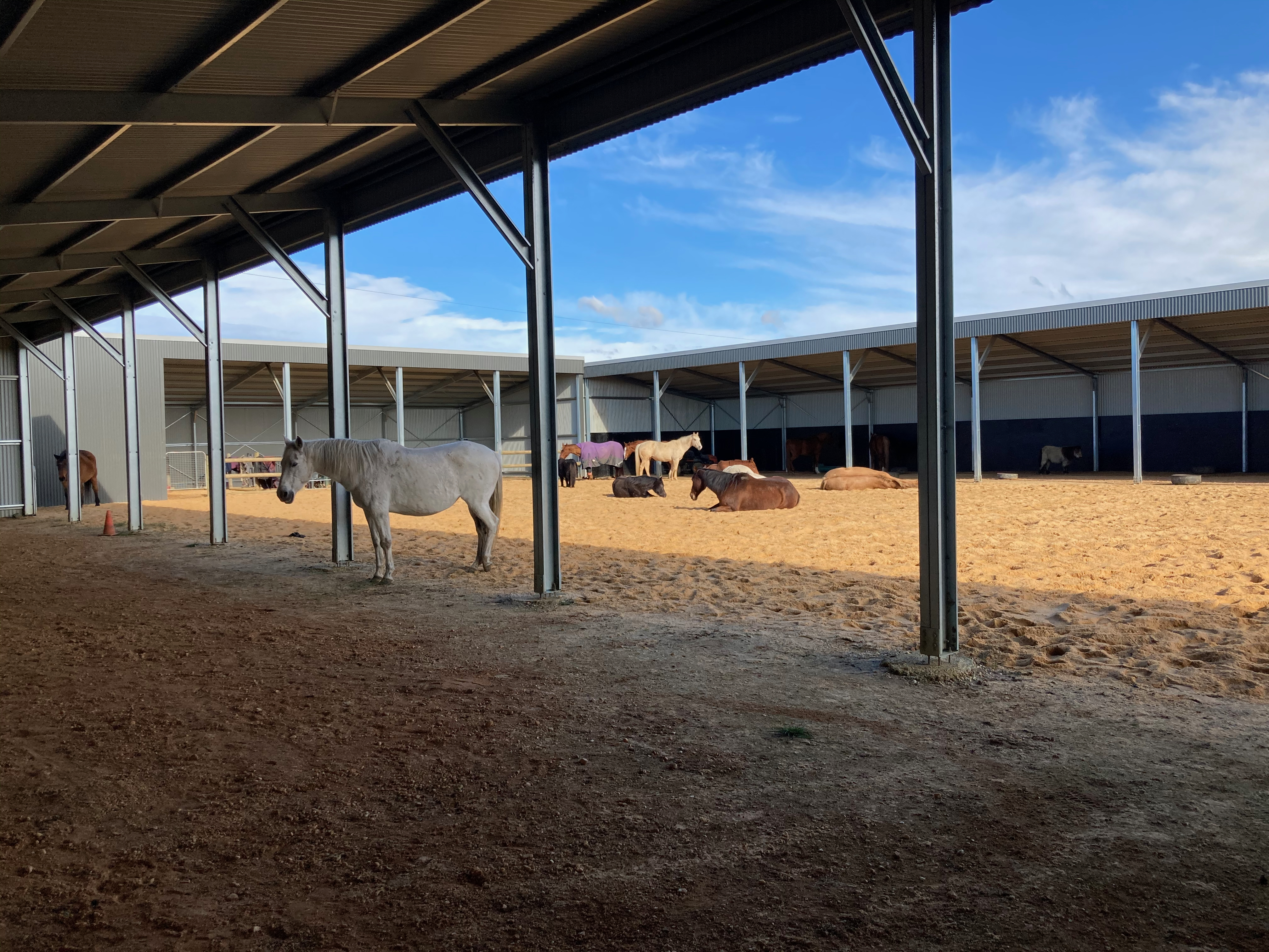 We have a large open-air arena surrounded by sheds on 3 sides that open to the arena to provide shelter from wind, rain, and sun.